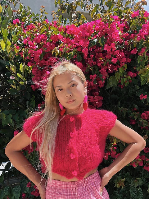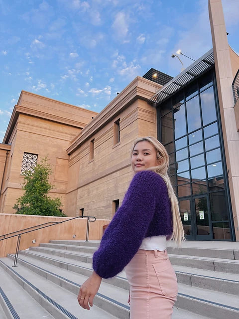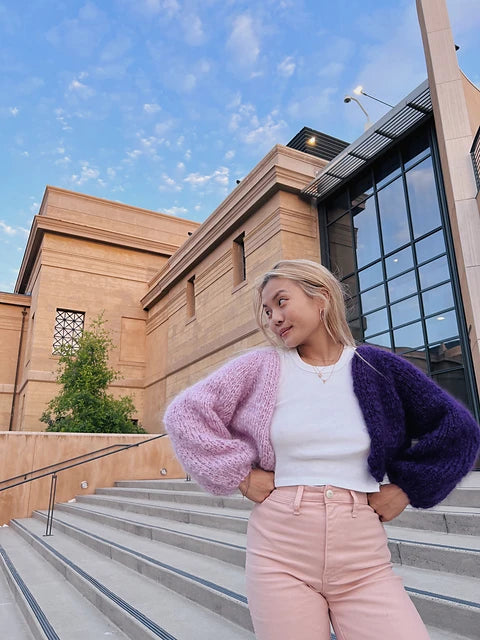 Are you ready to put your mohair suit? Keep it cropped, make it long. Knit it with long sleeves or keep it short and sweet. The Bennie Cardigan is versatile, fun, and a great way to bust through all that gorgeous mohair in your stash. Make it with a single thread of 100g/100m mohair or hold 3 strands of 50g/459 yds held together. If you want a thicker fabric, add more strands. Note that yardage estimates will change based on which technique you choose.