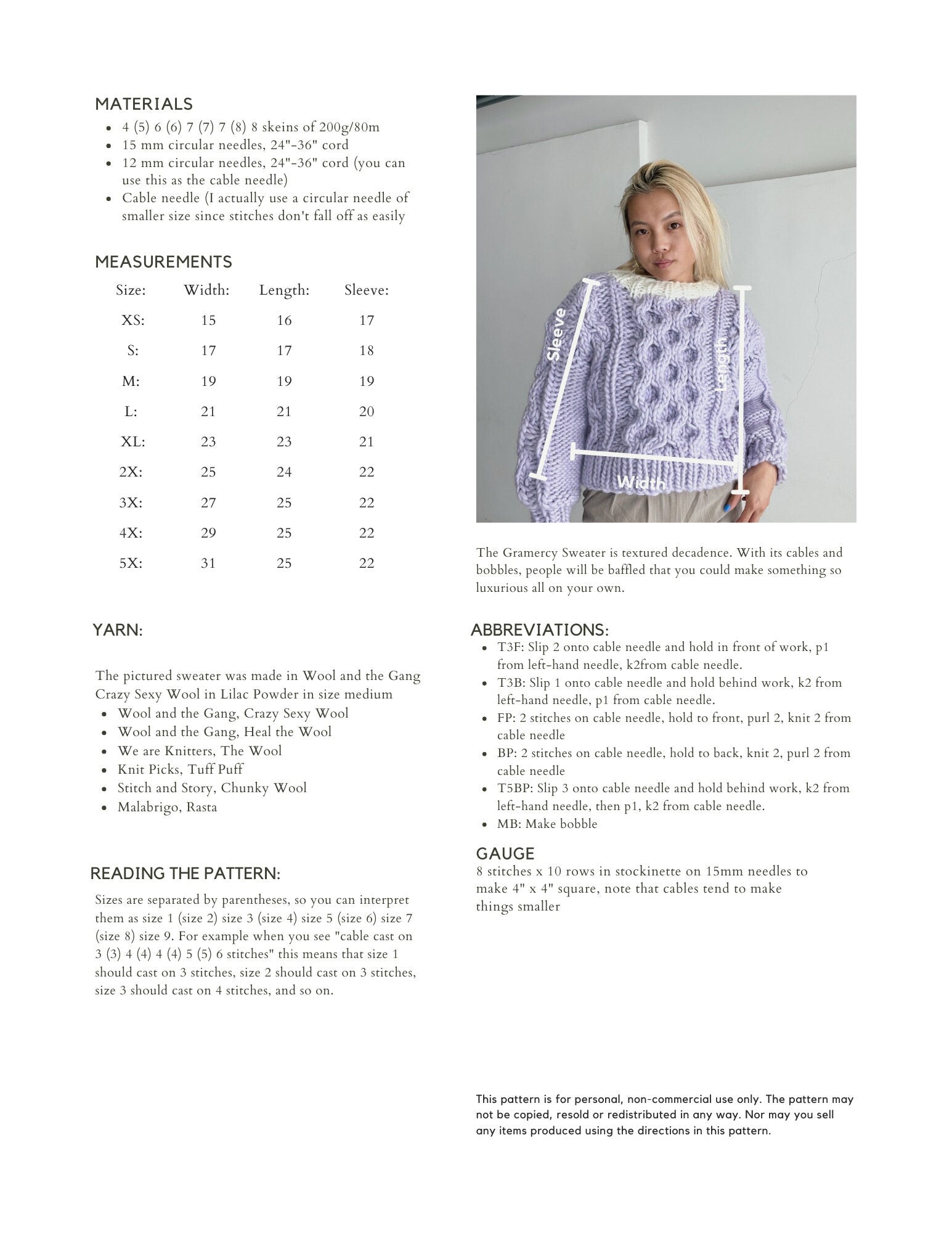 - 4 (5) 6 (6) 7 (7) 7 (8) 8 skeins of 200g/80m (if you want to do wide sleeves, add 1 (1) 1 (1) 1 (2) 2 (2) 2 skein(s))