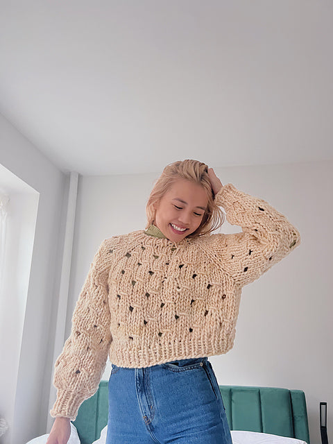 The Chunky Little Things Sweater is the textured sweater of your dreams. With its top down construction and eyelet texture, people will be begging you to make one for them.