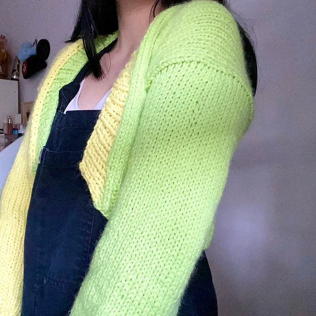 A chunky and boxy cardigan! This cardigan has a simple construction and is worked flat and the sleeves are picked up and worked in the round. It has wide sleeves and a cropped fit.