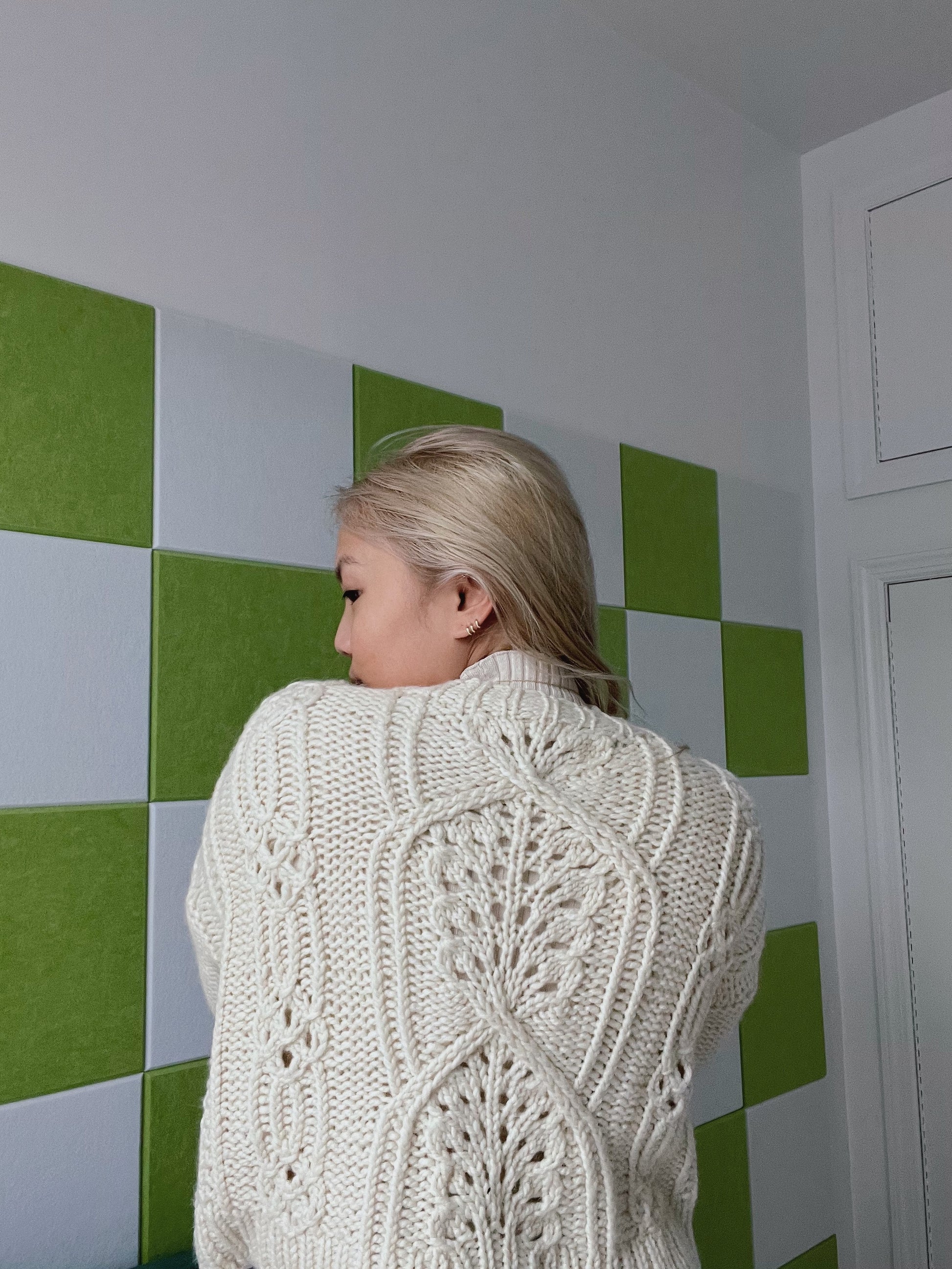 This pattern is suitable for beginners! You should be familiar with stockinette stitch! This pattern uses the following techniques: picking up stitches, lace stitches, and knitting in the round. I’ll be posting tutorials on my instagram!