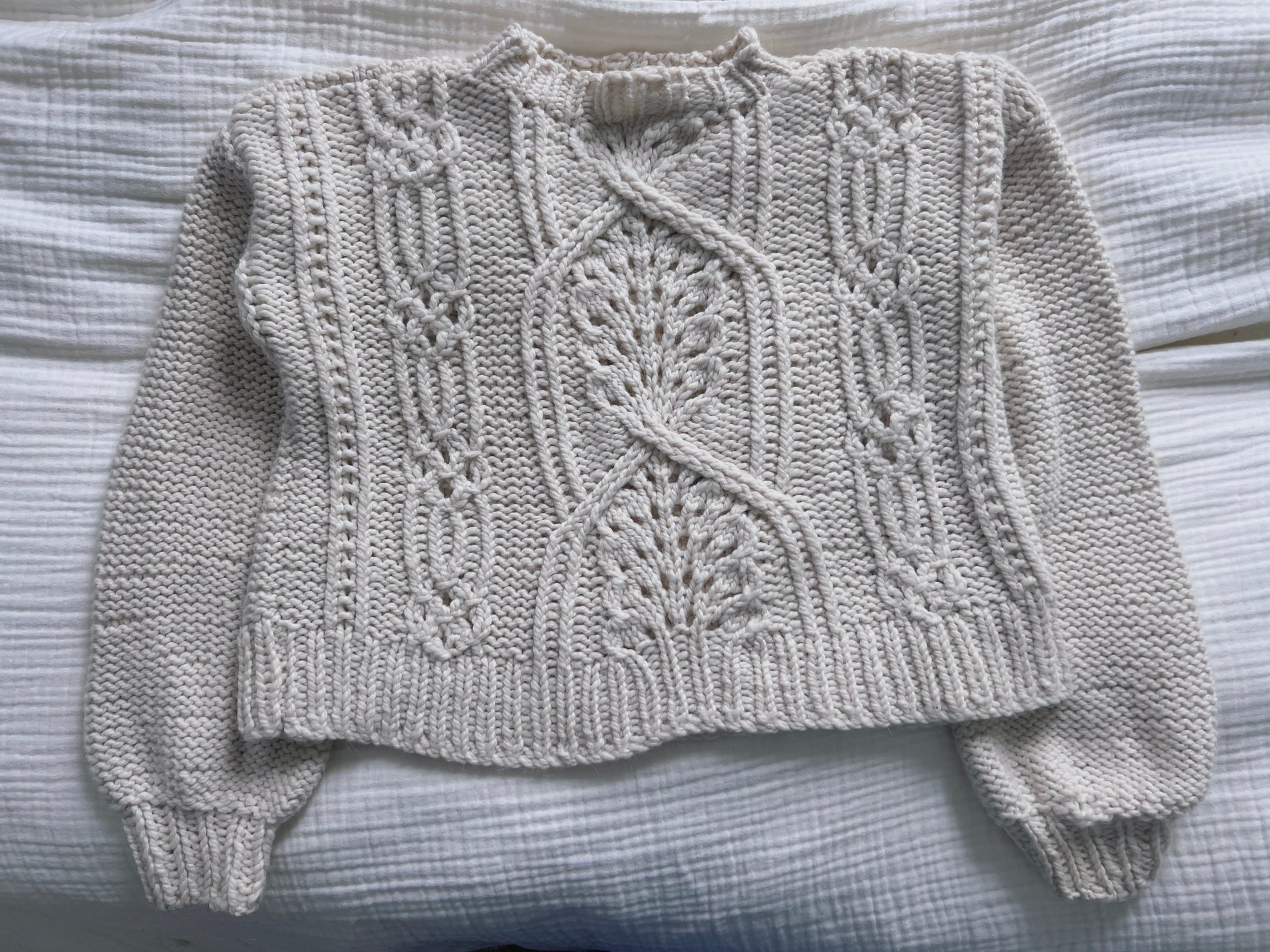 The Is It True Sweater. Decadent lace mixed with a touch of cables; it's the perfect sweater for the spring. Your friends will be amazed when you tell them you knit it yourself.