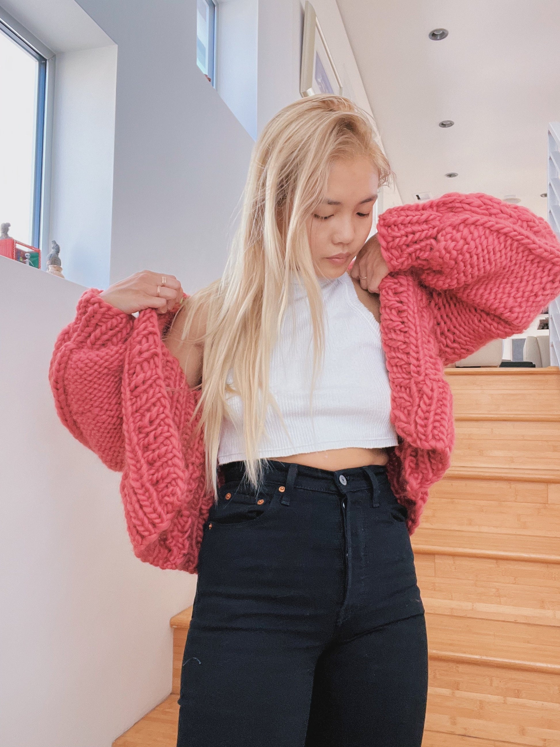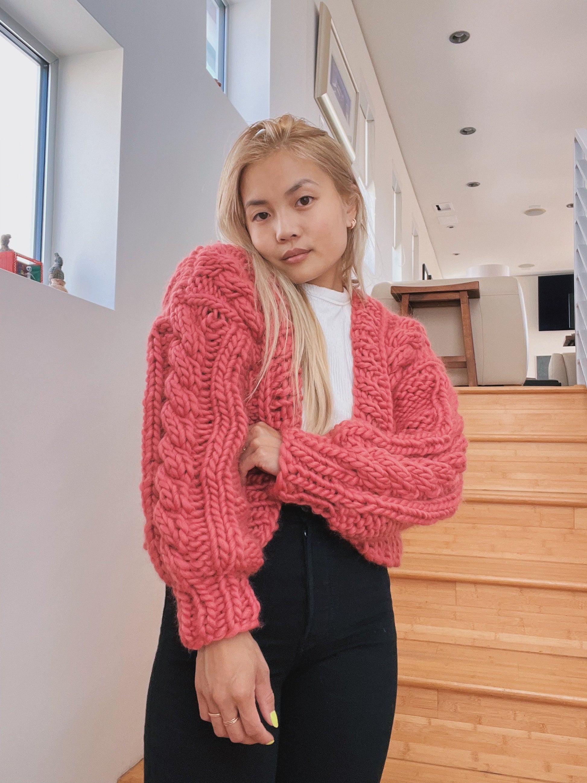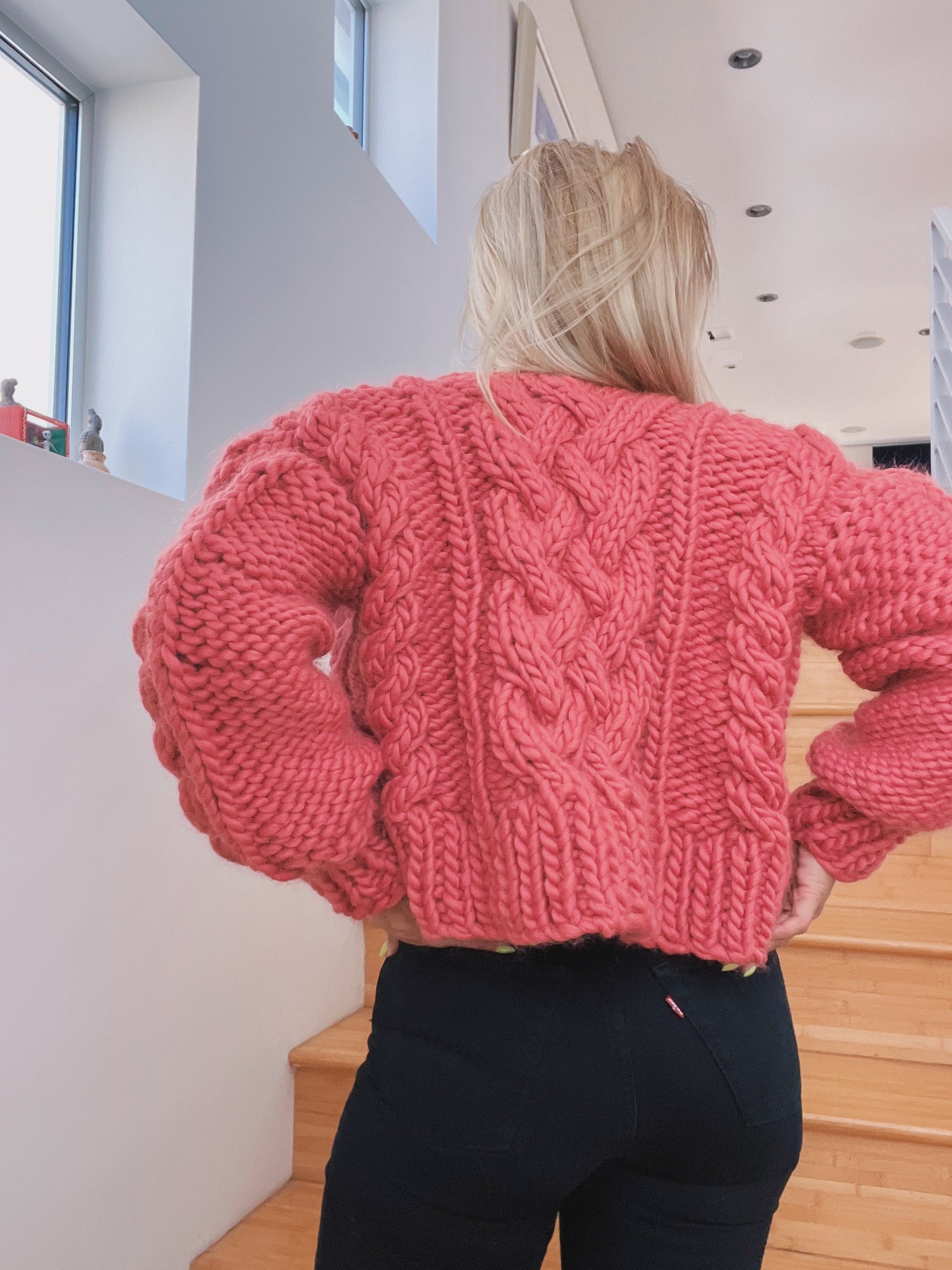 The cable cardigan you’ve been waiting for. With the option to make wide or fitted sleeves and its oversized fit, this is an instant heirloom. Constructed flat and in the round, it’s the perfect way to